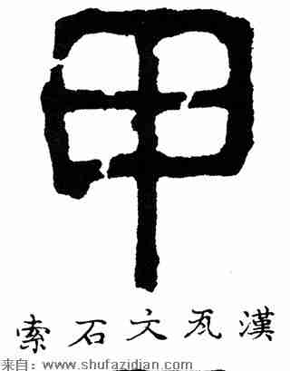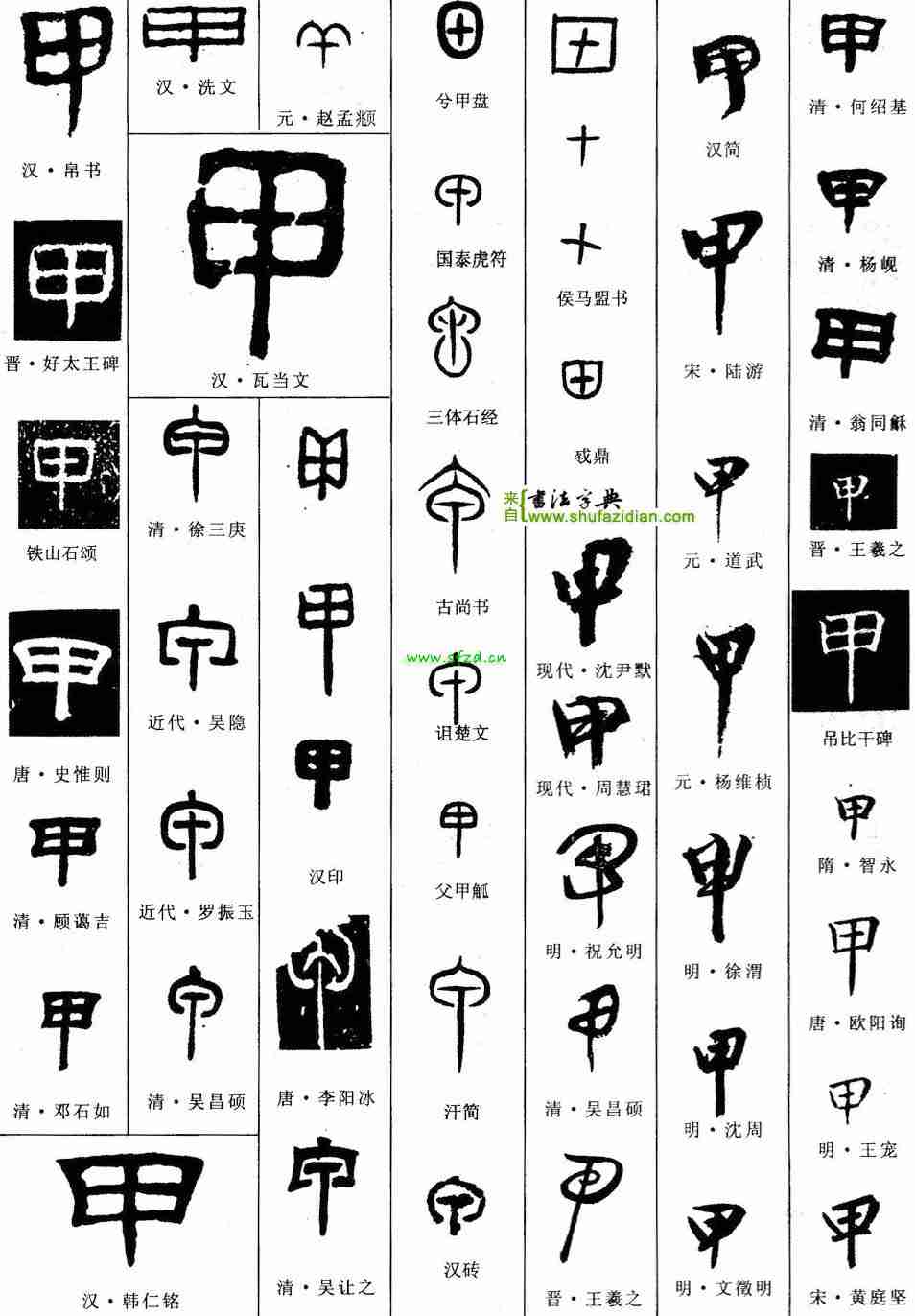 甲: 東方之孟,陽气萌動,从木戴孚甲之象。一曰人頭宐爲甲,甲象人頭。凡甲之屬皆从甲。
