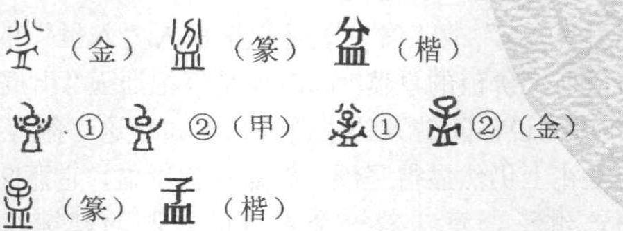“盆” 从分,从皿,分亦声,为带有象形韵味的形声会意字。 分,“八下之刀”,在这里是分娩的标意,是胎儿与母体的分离。“皿”又是钵盘一类的器具,分与皿上下相组构为“盆”,说明盆是事先准备好的接生器具。 古代妇人产子,一般采用蹲踞的姿势,我们从甲骨文、金文 “人” 下一倒 “子” 的 “居” 就能看出这一古典式的分娩法。“盆”的意境是,胎儿出生后先接在钵盘一类的器皿中,需要与母体分离,这种分离正好是在“盆” 中进行的。一个“盆”字犹如一个接生的小场景: “八” 是母亲分开的两腿,“刀” 是分离的工具,“皿” 是托儿的盘子。形如写真,风韵实足。 “盆”提供给我们的信息是,胎儿临产用盆钵之类的器具接生,故将临产称为 “临盆”。 “盆”的本意是形容、标示接生。但是后来一般用于名词和量词。倒是古代有一种“盆吊”的酷刑能够体现它的本意。生孩子,倒子形,头朝下,而盆吊的刑罚正是像“盆”形容、标示接生一样,将犯人倒置悬吊处死的。 古者“盆” 为量器,《墨子》 曰: “待汝以千盆,授我五百盆。”故“盆”既是承接斯人“入世”的用器; 也是估量斯人价值的享器; 同时也是祭祀斯人“出局”的礼器。“盆”可以说伴随着人的生前死后。如今这“盆”,在关中农村的丧礼上仍然显得坚硬。祭盆也称孝盆,它意味着嫡长子的财产继承,意味着一个古老的礼制的延续。 《说文》: “盆,盎也。” 同时释 “盎,盆也。”把猫叫成“咪”,不足为训。 “孟”从甲骨文到楷书,都是带有象形韵味的会意字 。 甲骨文❶的 “孟”( ), 从皿, 从倒巳,从四小点,皿声。“皿”是盆盘一类的器具,“巳” 原本为精虫,在这里与 “子” 同义,颠倒的 “巳” 是胎儿头朝下出生,四小点像羊水沾污小儿状。甲骨文❷的 “孟 ”( ), 简约了四小点,与❶同义。甲骨文的 “孟” 是胎儿临产的标意,用盆盘之类的器具接生。
