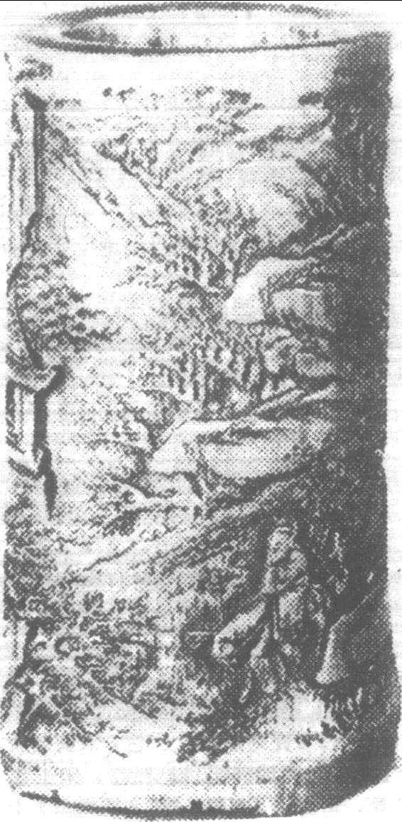 竹製筆筒 亦曰“筆桶”、“筆筩”,為置筆之具,屬“文房十友”之一。多屬竹製或紫檀,故每呈圓筩形。亦有以玉器、黄楊、漆器、陶瓷製作者。明屠隆《考槃余事》 卷四《文房器具箋》曰:“湘竹為之,以紫檀、烏木稜口鑲坐爲雅,余不入品。”筒上常刻有山水、人物、蘭竹、花鳥、詩赋等。竹筒鎸刻,時呈古色,文人刀戲易顯焉。置于書案,雅趣顿添。王獻之嗜愛斑竹筆筒,銘其筒曰“裘鐘”。 製竹筆筒之能工,以嘉定朱氏三代之名尤顯。其祖鹤(字子鳴,號松鄰,别號松齡)。,二世纓 (字清父,號小松)承襲父藝,發揚光大。三世稚征 (號三松)不替祖業,後歷三百載而盛名未衰。三世皆名匠,并為文人。此外,殷永清、潘西鳳等亦負盛譽。 |