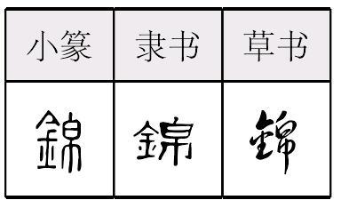 【析形】形声字。古文字形从帛,金声。 【释义】《说文》:“襄色织文。”本义是有彩色花纹的丝织品。衣服上绘绣图案不但标明地位,更主要是标明富有。绣是在绢帛织好后再加工的(刺绣),锦则是直接织出花纹图案的织品,都是富贵的象征,故锦绣常代指美好的事物或色彩鲜艳华美。[锦上添花]在美丽的锦织物上再添加鲜花。比喻略加修饰使美者更美,引申比喻在原有成就的基础上进一步完善。 【shape analysis】It is the pictophonetic character.In ancient character the part 帛(bó,silks)is as an ideogram and 金(jīn) as a phonetic sign. 【original meaning】 The silk fabrics with colored pattern.