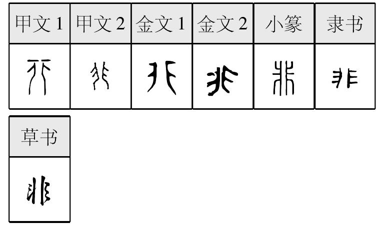 fēi表意,甲骨文1、金文1象二人相背之形,字形后来有讹变,隶定为“非”。本义表示违背,与“北”同源。(一说甲骨文2、金文2、小篆象左右张开的两个鸟翅形,以鸟翅相背之形表示互相违背。)与正确的相违背就是错误,故引申为错误的、反对、责难、不是等。 【辨析】 ❶以“非”作音符构成的形声字读音不同。fēi:啡、绯、菲、扉、蜚、霏、鲱∣féi:腓∣fěi:诽、悱、斐、匪∣fèi:痱∣péi:裴∣bēi:悲∣bèi:辈∣zuì:罪∣pái:排、俳、徘。 ❷非/匪/微 这三个字都可以用作否定副词,读音相近,是同源字。 ❸非/诽 见103页“诽”。 非fēi (甲) (篆) 一说为象形字,金文像两翅相背,本义为相反、违背;一说为会意字,甲骨文与“北”相仿,是两排人背靠着背。战斗中腹背受敌时,往往摆开这种阵式。作意符生成的字有靠。靠,古作“相违”讲,今为“相依”。作声符生成的字有: fei 阴平:扉(扉页) 蜚(流言蜚语) 霏(今我来思,雨雪霏霏) 绯(红色。“新授铜符未著绯,因君装束始光辉。”——白居易) 啡(咖啡) 菲(“人间四月芳菲尽,山寺桃花始盛开。”——白居易) 鲱(鱼名) 阳平:腓(胫骨后的肉,即腿肚子) 上声:匪(匪徒) 榧(一种常绿乔木) 诽(诽谤) 悱(悱恻) 翡(翡翠) 斐(斐然成章) 菲(妄自菲薄) 去声:痱(痱子) bei 阴平:悲(悲哀) 去声:辈(前辈) péi 裴(姓氏) pái 排(排除) 徘(徘徊) 俳(俳句,一种日本短诗) 相关链接 排、俳、徘,《说文》归入形声字,以“非”为声,古读为“裴”。“大排档”之“排”为一种西式食品(pie)的译音。