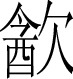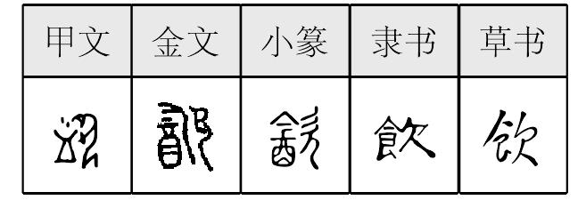 【析形】会意字。甲骨文字形像人向酉(酒坛)伸舌头饮酒的样子。金文字形舌头部分脱离人形,并变形声化为“今”,作声符,人形亦变成“欠”(表呼吸),作意符。小篆字形从之。隶书字形改作从食,从欠,为后世所本。 【释义】《说文》:“歠也。”本义是饮、喝。又指所饮的饮料,或指酒,或指水。由喝引申为含忍、吞,如[饮恨](抱恨含冤)、[饮泣](泪流满面,进入口中,形容极度悲痛)。 【shape analysis】It is the associative character.In Oracle,the character is shaped like a drinking person stretching his tongue into酉(yǒu,wine vessel).The tongue part is detached from the human shape and transformed into a pictophonetic sign as今(jīn) in Bronze Inscriptions.The human shape is transformed into欠(qiàn,refers to breath) as an ideogram.This shape is followed in Small Seal script while it is transformed into an associative character in official character formed with 食(shí,food)and 欠. 【original meaning】Drinking.