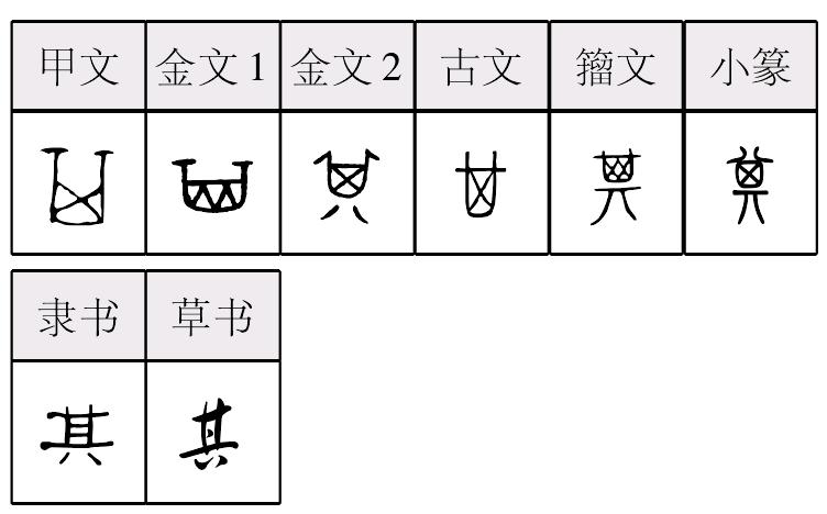 睡虎地秦墓竹簡·日書乙種202,戰國至秦 春三月,甲乙死者,其後有憙,正東有得。 甲骨文象簸箕形。西周金文下部逐漸演化作“丌”。戰國文字承襲西周金文。“其”、“丌”、“箕”乃一字之分化。