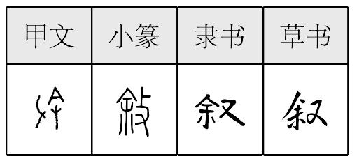 xù形声,甲骨文从又,余声,小篆把意符改为攴,又为手,与攴都表示动作行为,隶定为“敍”。本义为排列次序,引申为次序、次第、评议等级或次第、记述、叙说、交谈、一种文体等。变体作“敘”,俗字作“叙”。《异体字表》以“敍”“敘”为异体字。 【辨析】 ❶以“叙”作音符构成的形声字一般读xù:溆。 ❷叙/述/陈/说 见382页“述”。 叙敘;敍xù(9画) *叙〔敍 敘〕xù9画 又部 |