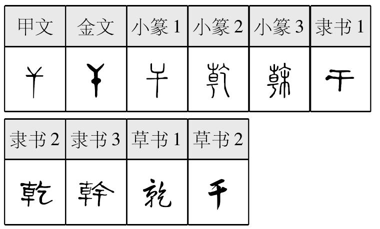 干,象形,甲骨文、金文象有丫杈的木棒形,有的在丫杈的两端或中间绑上石头,本义读ɡān,上古先民的原始猎具或武器。(一说象有羽毛装饰的盾牌形。)小篆1字形稍变。引申为盾牌(古代用来挡刀箭护卫身体的兵器)、触犯、干涉、牵连等,假借为河岸、天干(甲、乙、丙、丁、戊、己、庚、辛、壬、癸的总称,古代用作表示次序的符号)等。乾,形声,小篆2从乙,倝(ɡàn)声,读ɡān,本义为草木冒出地面,假借为没有水分或水分很少,由此引申为枯竭、不使用水的、干制的食品等。榦,形声,从木,倝(ɡàn)声,读ɡàn,树干。俗字作“幹”,意符改为干。引申为事物的主体或重要部分、干部、做(事情)、担任、能干的、有能力的等。《异体字表》以“榦”为“幹”的异体字。《简化字表》把“乾”“幹”合并简作“干”,用同音或近音字代替。 【辨析】 ❶“幹”与“榦”不是等义异体字,“干”与“乾”“幹”不是等义简繁字。 ❷以“干”作音符构成的形声字读音不同。ɡān:肝、竿、矸、酐∣ɡǎn:赶、杆、秆∣ɡàn:旰∣hān:鼾、顸∣hán:邗∣hǎn:罕∣hàn:汗、旱∣jiān:奸∣kān:刊∣xuān:轩∣àn:岸∣jié:讦。 ❸以“幹”作音符构成的形声字一般读ɡǎn:擀。 ❹干(乾)/蔫/旱 “干(乾)”指水分少,“蔫”和“旱”都有草木干枯义。这三个字读音又相近,是同源字。 ❺干(幹)/办/搞/弄/做 见122页“搞”。 ❻干/盾 见90页“盾”。 ❼“乾”另读qián,见326页。 【构词】 干犯(干犯)∣干戈(干戈)∣干扰(干擾)∣干涉(干涉)∣干预(干預)∣干政(干政)∣干支(干支)∣干杯(乾杯)∣干柴(乾柴)∣干果(乾果)∣干旱(乾旱)∣干净(乾淨)∣干洗(乾洗)∣干燥(乾燥)∣饼干(餅乾)∣吹干(吹乾)∣口干舌燥(口乾舌燥)∣干部(幹部)∣干才(幹才∕幹材)∣干道(幹道)∣干活(幹活)∣干劲(幹勁)∣干练(幹練)∣干事(幹事)∣干线(幹線)∣骨干(骨幹)∣精干(精幹)∣躯干(軀幹)∣树干(樹幹∕樹榦)∣枝干(枝幹∕枝榦)∣主干(主幹∕主榦) 干gàn (甲) (篆) 《诗·大雅·公刘》:“弓矢斯张,干戈戚扬。”干,甲骨文像长杈,本是一种武器。引申为干涉、冒犯。因与“乾”(“干湿”的“干”的繁体)同音,成为它的简化字。声母主要在舌根音g、k、h间变化,作声符生成的形声字有: gan 阴平:肝(肝胆相照) 杆(旗杆) 竿(竹竿) 玕(美石也) 忓(干扰也) 矸(煤矸石) 上声:赶(赶走) 杆(枪杆子) 擀(擀面杖) 去声:旰(宵衣旰食) 骭(小腿) kan 阴平:刊(报刊) 去声:衎(刚直,多用于人名) han 阴平:鼾(鼾声) 顸(粗大也) 阳平:汗(成吉思汗) 邗(邗江,县名,在江苏省) 上声:罕(罕见) 去声:汗(血汗) 扞(同“捍”) 旱(干旱) 捍(捍卫) 悍(强悍) 焊(焊接) 睅(眼睛瞪大突出) àn 岸(古代读gān,现为零声母) 犴(一种野狗) jiān 奸 qián 靬(骊靬,古县名) xuān 轩(轩然大波) 相关链接 从gan到jiān是舌根音变舌面音。