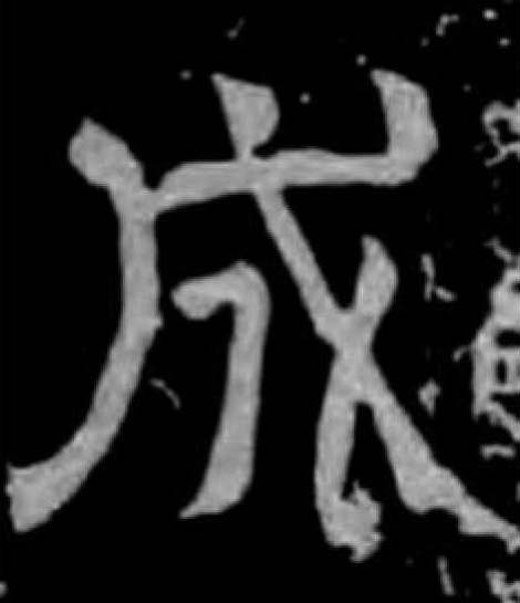 多寶佛塔銘,唐 九百間成。 《説文》: “成, 就也。 从戊丁聲。 , 古文成从午。 ” 關於“成”字造字意圖,説法不一,或説甲骨文从戊从丁,“丁”爲城邑之形,爲“城”之初文; 或説金文从戌从丁,丁亦聲,或从戌从十。春秋沇兒鐘銘文中“丁”訛變作“个”,“个”象古文 “午”形,《説文》 古文所從。隸變楷化作“成”。隋元鍾墓誌字形本於 《説文》古文。