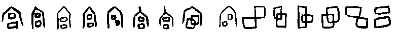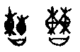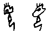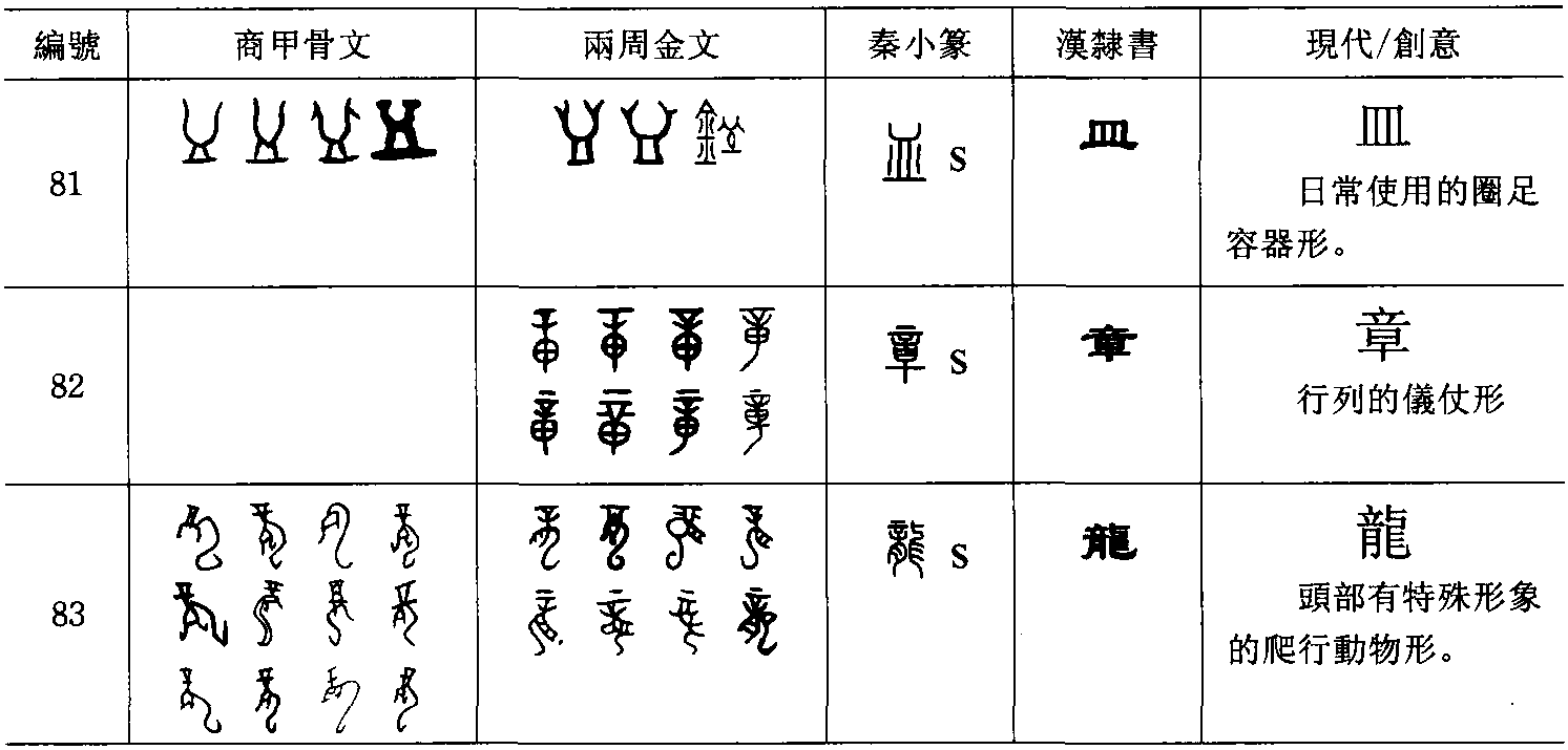 皿(字81)【 , 飯食之用器也。 象形。 與豆同意。 凡皿之屬皆从皿。讀若猛】,畫一個日常使用的圈足容器形。特徵是不畫出器的口緣而與容器豆 (![]() ![]() )有所分別。章(字82)【 ,樂竟為一章。 从音十。 十,數之終也】,象行列中手持的前導儀仗形。本是獨體的象形字,依 《說文》的解說則為表意字。龍(字83)【 , 鱗蟲之長, 能幽能明, 能細能巨, 能短能長。 春分而登天,秋分而潛淵。 从肉 , 肉飛之形,童省聲。 凡龍之屬皆从龍】,象一隻頭部有特殊形象的爬行動物形,身子的彎曲與嘴巴同向的為另一字。《說文》竟以為是童的省聲。有時候物體的某一部分非常具有特性, 深為大衆所了解, 一眼就可以辨識出來,不會產生意義上的混淆,不妨就以之代表其物體,節省書寫的時間和材料,以致形式上為: (b)描寫部分的形象以代表整體,埃及的聖書體就有很多以動物頭部代表整體的字。中國文字例子較少,大概是因為中國文字以簡要的線條描繪形體,不易確定描繪的動、植物的種屬。