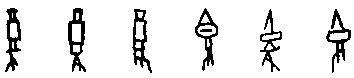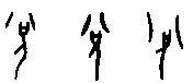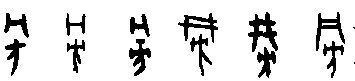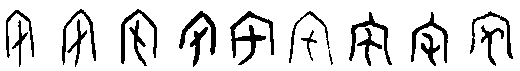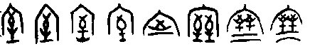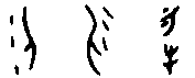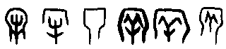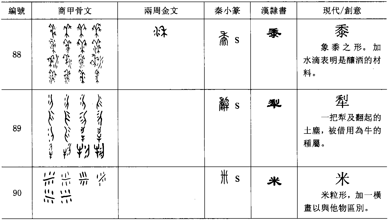 B.複體的形式 有時某些物體的輪廓相類或近似,就要加上輔助的事物,才能使其指稱明白。由於它已不純粹是描寫一物件的實體,還需要附加補充的說明,以致在形式上成為複體的形式。有人就會認為它已含有本形以外的成分,類近表意,不是純粹的象形。此形式在實物形體之外所加的部分,一是已成字的,一是尚不成字的。 (a)附加符號的複體象形,如: 而(字66),象下頷的鬍鬚形。如不畫出下頷的輪廓,就不易明確其指稱。 所加部分本不成字, 算是符號 ( )。黍(字88)【 , 禾屬而黏者也。 以大暑而種故謂之黍。 从禾雨省聲。孔子曰,黍可為酒。故从禾入水也。凡黍之屬皆从黍】,字的本體象黍之形,但植物的外形,有時很難用簡單的輪廓加以區別其間種屬的不同。黍是商代釀酒的主要材料,因此就在字形的輪廓之外加上水滴,以明示此植物的特殊用途。此水滴的數量可以不拘,雖也可以寫成水流的樣子,但主體是水滴,故還視同符號。犁(字89)【 , 耕也。 从牛, 黎聲】, 耕牛所拉的犁, 其輪廓與刀子一類的刃器相似,因此加上翻起的土塵以為分別。土塵可寫成二點或三點,故也視為符號。它被借用為牛屬的一種 (或可能以耕田的水牛以與拉車的黃牛作區別),因常與牛合文而終成一字,並成為形聲字的形式。