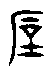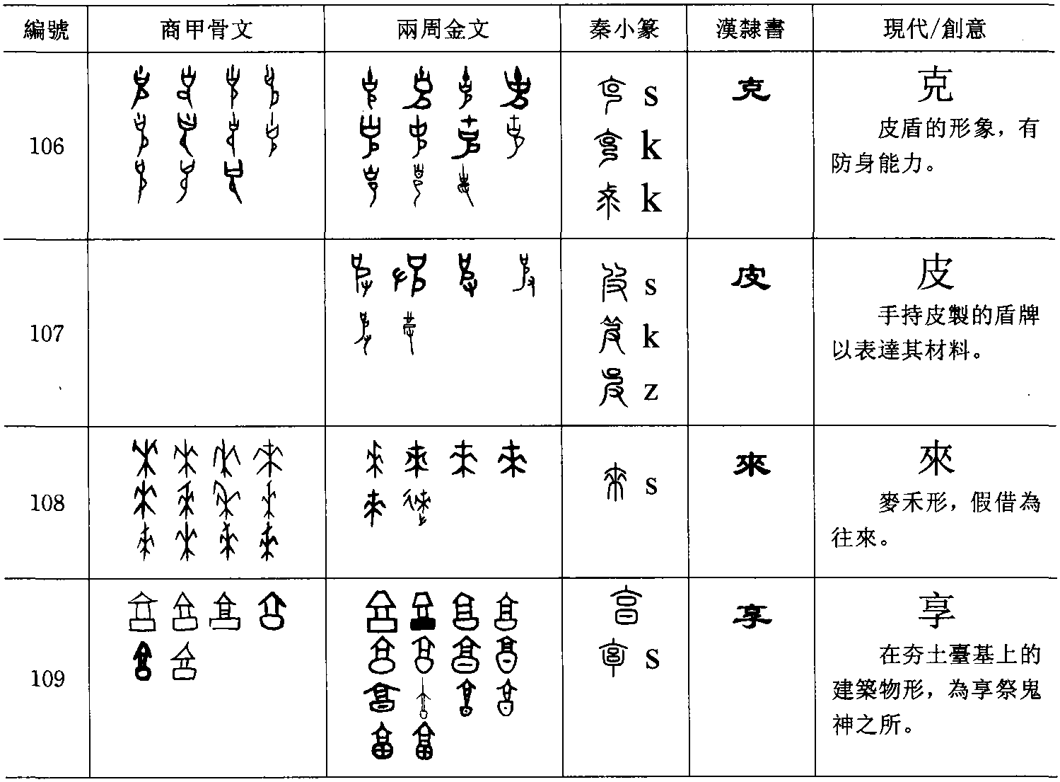 石(字101)【 , 山石也。在厂之下。 口象形。凡石之屬皆从石】,以有尖銳棱角的石塊表意,為使意義更清楚,加坑陷之形明示石塊挖土之功能。尿(字102)【 ,人小便也。从尾水】、屎【 ,糞也。从艸,胃省聲】, 【《廣韻》𦳊, 《說文》曰糞也。 本亦作矢, 俗作屎】, 象一人排泄尿與屎之狀。人的排泄物無獨特的形狀,若不加上人所排出該物的部位,不但兩者的指稱難明,也易於與其他小東西混淆。胃(字103)【 ,穀府也。 从肉鹵。 象形】, 消化食物的胃的形狀加上肉或腸子形,以免與其他形狀類似之物形混淆。㳄(字104)【 ,慕欲口液也。从欠水。凡㳄之屬皆从㳄。 ,㳄或从侃。 , 籀文㳄】, 口水和其他液體難於分別, 加上一人張口而流出之狀,明示其物質所出之處。果(字105)【 , 木實也。 從木, 象果形在木之上】, 加上樹木的形象,才易明白是果子的形象。如前所言,這一類複體的象形字不妨也可視為下一類的表意字。一般的區別是使用為名詞者為象形,使用為其他詞類者為表意。為省事起見,大可以把非形聲字都視為表意的一類,以與形聲的一類分別。象形字一般是名詞,但較晚的時代可能被用以代表其他類別的意義。如: 高(字73),象一高大建築物之形,口為後來無意義之填空。使用時大多引申為高低或遠近的意義,雖然商代以來的文獻不見使用以為高大的建築物之義, 但之前的時代有可能使用以表達高大的建築物 ( ![]() ![]() )。克(字106)【 ,肩也。 象屋下刻木之形。 凡克之屬皆从克。 古文克。 ,亦古文克】,從皮字(字107)【 ,剝取獸革者謂之皮。从又。 凡皮之屬皆从皮。 , 古文皮。 , 籀文皮】作手持皮製的盾牌狀,推知克字是描寫皮盾的形狀。但它並不用以表示盾牌,而是表達能夠用以防身的能力。來(字108)【 , 周所受瑞麥來麰也。 二麥一夆, 象其芒朿之形。天所來也,故為行來之來。詩曰,詒我來麰。凡來之屬皆从來】,本是來麥的全株形狀,可能因它是外來的品種,使用時大多引申 (或有可能經由假借)為往來的意義。享(字109) 【 , 獻也。 从高省。 曰象孰物形。 經曰, 祭則鬼亯之。 凡亯之屬皆从亯。 ,篆文亯】,象在夯土臺基上的建築物形, 因是享祭鬼神的所在,故用以為動詞而不用為臺基上的高大建築物之義。