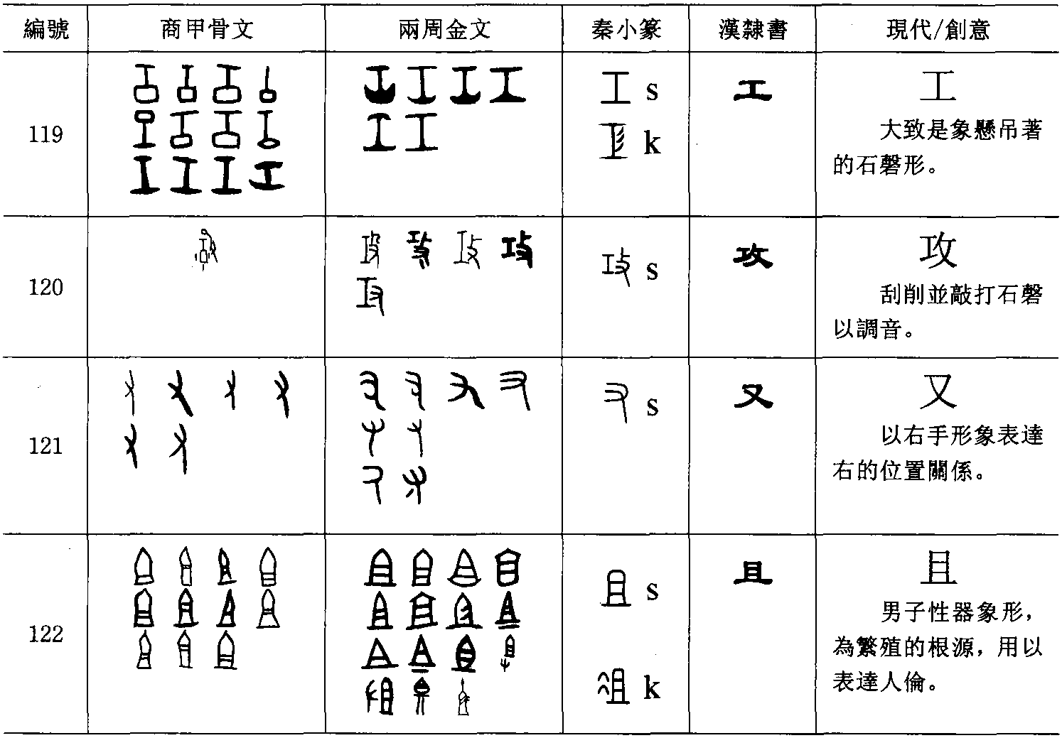 一【 , 惟初大極, 道立於一。 造分天地, 化成萬物。 凡一之屬皆从一。 ,古文一】、二【 ,地之數也。从耦一。凡二之屬皆从二。 ,古文二】、三【 ,數也。天地人之道也。於文,一耦二為三成數也。 凡三之屬皆从三。 , 古文三】、 四(字114)【 , 侌數也。 象四分之形。 凡四之屬皆从四。 , 古文四如此。 , 籀文四】, 以一、二、三、四等長之線條表達數量的概念。後來因為線條的數量可能起混淆,又分別造更為明確的字形。五【 ,五行也。 从二,侌昜在天地間交午也。 凡五之屬皆从五。 , 古文五如此】、六 【 , 易之數, 侌變於六, 正於八。 从入八。 凡六之屬皆从六】、七(字115) 【 , 昜之正也。 从一, 微侌從中衺出也。 凡七之屬皆从七】、八(字116)【 。 別也。 象分別相背之形。 凡八之屬皆从八】、十(字117) 【 , 數之具也。 一為東西, 丨 為南北,則四方中央備矣。凡十之屬皆从十】,借簡單符號以表達最常使用的數量概念。丩(字118)【 ,相糾繚也。 一曰, 瓜瓠結丩起。 象形。 凡丩之屬皆从丩】,兩段線條相糾纏之狀,表示糾纏的狀況。B. 單體的物體,它和象形字的不同點在於借形體以表達與該形體有關,但卻超乎該形體以外的概念,如: 秋(字50),甲骨文取象蝗蟲或蝗蟲受火烤,以秋季景象表達秋季。如以字形而論, 前形可歸於象形, 後者則必為表意字 ( )。大(字74),是一個大人的正視形象,表達與小孩相比的個體之大,重點是概念而非大人的形體 ( )。工(字119)【工,巧飾也。象人有規榘,與巫同意。凡工之屬皆从工。 , 古文工从彡】, 大致是象懸吊着的石磬形, 是攻字(字120)【 , 擊也。 从攴工聲。 】所敲打的器具形, 它是樂工所常敲打的樂器,故借用以表達樂工、工匠之意,也表達專業者的技術之工巧。𠂇 【 , 左手也。 象形。 凡𠂇之屬皆从𠂇】、又(字121) 【 , 手也。象形。三指者,手之列多略不過三也。凡又之屬皆从又】,以人的左右手的形象表達其所在的左與右的位置關係。且(字122)【 ,所以薦也。 从几, 足有二橫。 一, 其下地也。 凡且之屬皆从且。 ,古文以為且,又以為几字】 【 ,始廟也。 从示且聲】,男子性器象形,為人類繁殖的根源,就以之表達人倫的祖父。後借為語詞,乃加示而成祖以為分別。