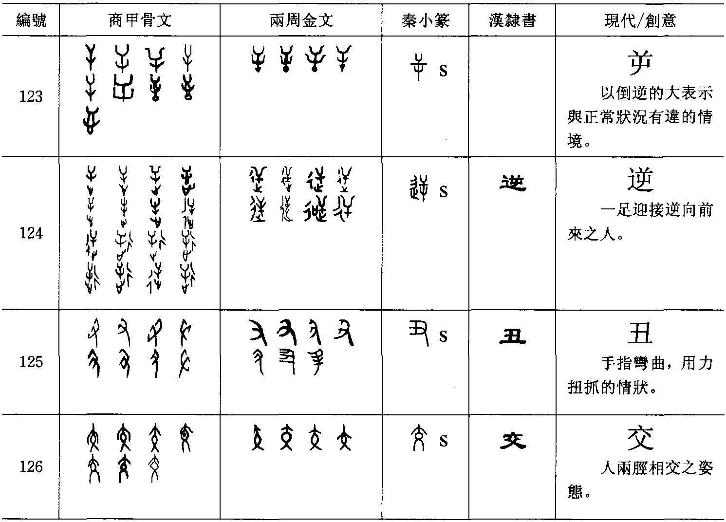 屰(字123)【 , 不順也。 从干, 下凵屰之也】, 大是人體的正常姿態,以倒逆的大表示與正常狀況有違的情境。後被併入逆(字124)【 , 迎也。 从辵屰聲。 關東曰逆, 關西曰迎】, 逆可能表現一足前迎逆向前來之客人,是表意字,非形聲字。丑(字125)【 , 紐也。 十二月萬物動用事, 象手之形。 日加丑亦舉手時也。凡丑之屬皆从丑】,手指彎曲之狀,表示用力扭抓的動作。假借為干支。交(字126)【 , 交脛也。 从大, 象交形。 凡交之屬皆从交】, 以人兩脛相交之姿態,表達交結的情況。C. 形體加符號 牟 【 ,牛鳴也。 从牛, 象其聲气从口出】, 以彎曲之 符號表達牛所呼出之氣。刃(字127)【 , 刀鋻也。 象刀有刃之形。 凡刃之屬皆从刃】, 一短畫指出刃在刀上的部位。