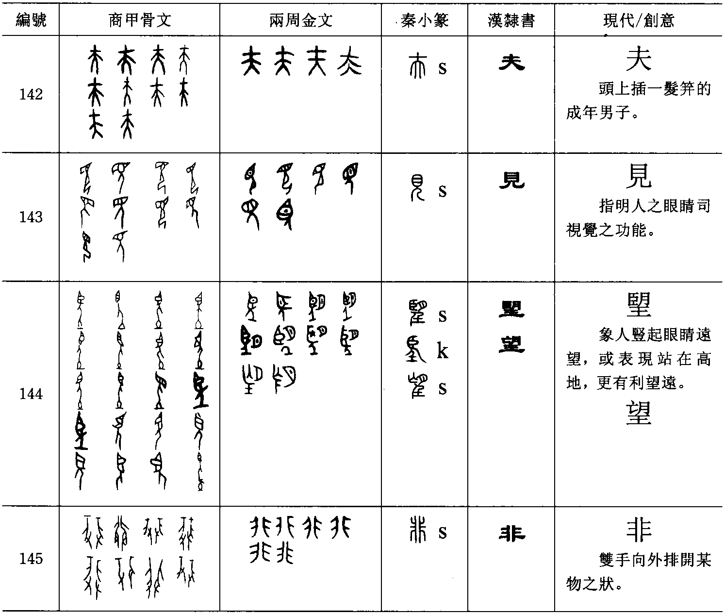 朢(字144) 【 , 月滿也。 與日相望, 似朝君。 从月从臣从壬。壬,朝廷也。 , 古文朢省】 【 , 出亡在外望其還也。 从亡朢省聲】,一人豎起眼睛遠望,或表現站在高地,更有利於望遠。後來加月以指稱月十五的朢日,成為形聲字。可能眼睛部分先訛變為耳,再訛變為亡。非(字145) 【 , 韋也。 从飛下翅。 取其相背也。 凡非之屬皆从非】,排的字源,作雙手向外排開某物之狀。所排的東西不成字。假借為否定副詞。、舞(字146) 【 , 豐也。 从林𡘲, 𡘲, 或說規模字。 从大卌。卌, 數之積也。 林者, 木之多也。 與庶同意。 商書曰, 庶艸緐緐】【 ,樂也。 用足相背。 从舛聲。 ,古文舞从羽亡】,一人雙手持舞具在跳舞之狀。舞具不成字。次(字147)【 ,不前不精也。 从欠二聲。 , 古文次】,說話或用食時口噴出殘餘物為不良的行為。殘餘物不成字。旁(字148)【 ,溥也。 从二闕,方聲。 , 古文旁。 ,亦古文旁。 , 籀文】, 犁形的方之上加犁壁, 犁壁把挖起的土塊推到兩旁。犁壁不成字。