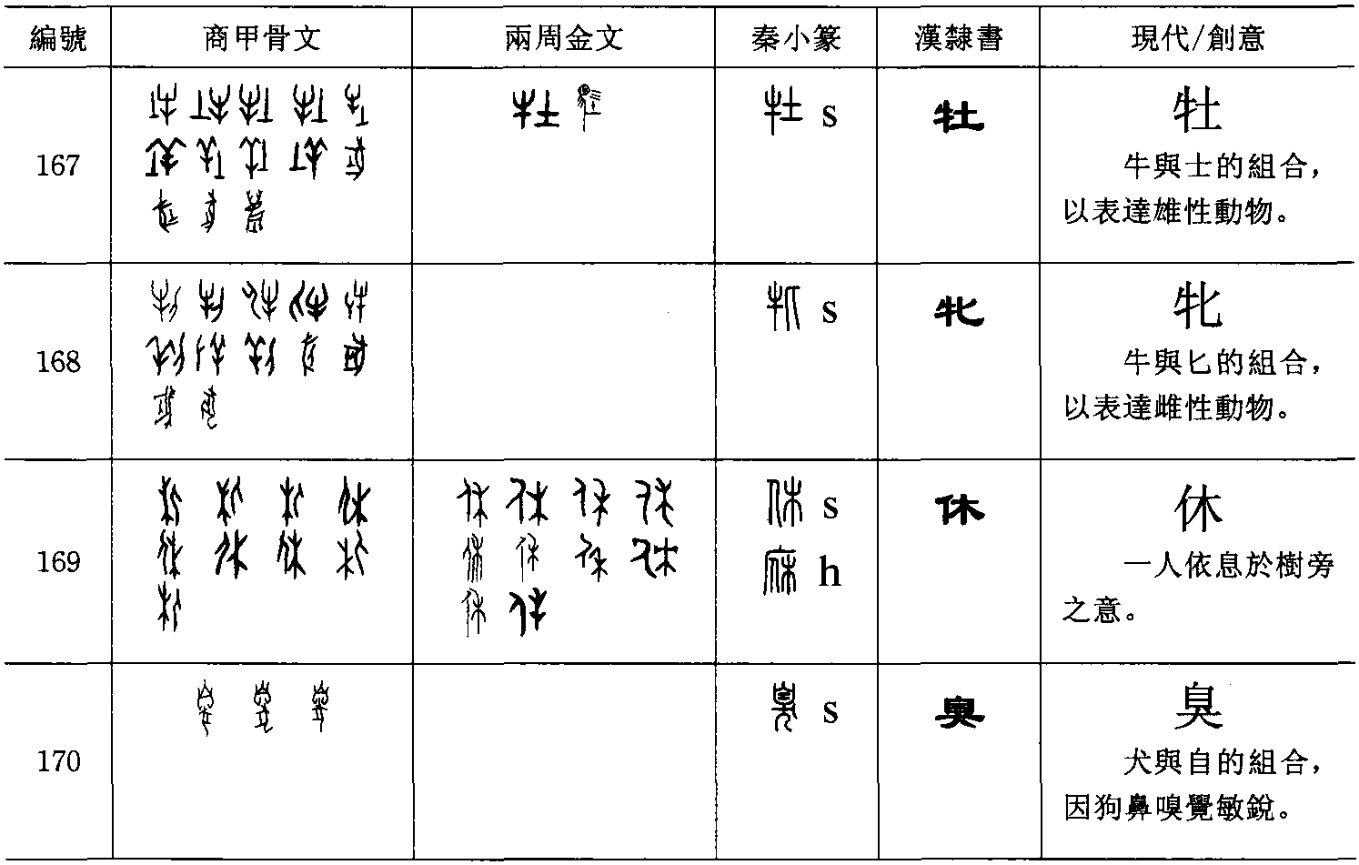 茲(字163)【 ,微也。 从二幺。 凡𢆶之屬皆从𢆶。】【 , 艸木多益。从艸,絲省聲】,兩束絲並列,創意不詳,假借為語詞。戔(字164)【 , 賊也。 从二戈。 周書曰: 戔戔。 巧言也】, 兩戈相向有所殘害,後改為兩戈相疊。誖 【 , 亂也。 从言, 孛聲。 , 誖或从心。 , 籀文誖从二或】,甲骨文作兩盾相對撞擊之狀,可能是表達慌急之時隊伍排列不整的現象( )。後來以形聲字取代。友(字165) 【 , 同志為友。 从二又相交。 , 古文友。 , 亦古文友】,朋友相互以右手輔助。金文字形下加一深坑,可能表達朋友相互協助挖掘深坑之意。劦(字166)【 , 同力也。 从三力。 山海經曰: 惟號之山, 其風若劦。凡劦之屬皆从劦】,作三把挖土工具協作,或共同挖掘深坑之狀。F. 不同字形的複合體 以其間相涉及的關係表意,為後來常見的表意字結構,相當於 《說文》的會意字。細分的話尚可分兩類: 一是構件間可掉換位置,表示意義是通過聯想而得, 如牡(字167) 【 , 畜父也。 从牛土聲】、 牝(字168) 【 , 畜母也。 从牛匕聲】, 牛與士或匕的組合, 用以表示動物的雄與雌性別。位置可左右對調,甚至上下排列。甲骨文或以豬犬與士或匕組合用以表達各種動物的雌雄。 吠 【 , 犬鳴。 从口犬】表達狗之口所發出之叫聲,犬與口也不必有固定的位置組合。