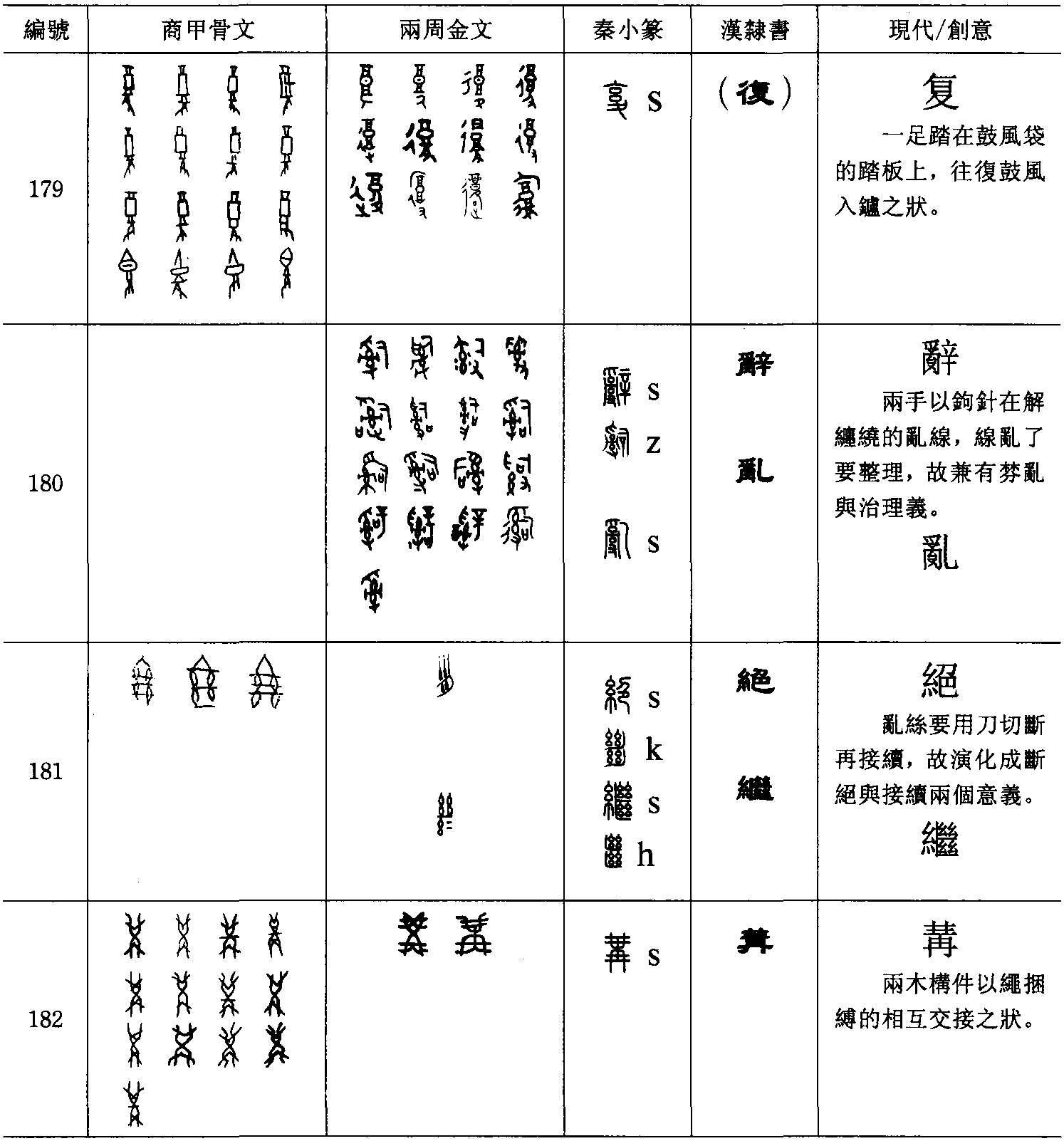 片【 , 判木也。 从半木。 凡片之屬皆从片】、 爿(字176)【爿, 反片為爿。讀若牆】,分析木字為二,右半的片、左半的爿。爿字甲骨已有,為牀之象形。反之成片字,《說文》則有片無爿,且以為从木字分析所得。段注補爿字,以為反片為爿。子(字177)【 ,十一月陽氣動、萬物滋。 人以為稱。 象形。 凡子之屬皆从子。 , 古文子从巛, 象髮也。 , 籀文子囟有髮髮, 臂脛在几上也】、𠫓 【 , 不順忽出也。 从到子。 易曰: 突如其來, 如不孝子突出, 不容於內也。 𠫓即易突字也】, 子為幼兒正視形, 倒之成𠫓, 頭在下則不順。彳 【 , 小步也。 象人脛三屬相連也。 凡彳 之屬皆从彳 】、 亍【 , 步止也。 从反彳。 讀若畜】, 乃分析自十字路形象的行字(字178)【 , 人之步趨也。 从彳 亍。 凡行之屬皆从行】。 彳、亍常作有關行道之字的意符,意義並無不同。(三)形聲 約同 《說文》的形聲,其解釋是 “以事為名,取譬相成,江河是也”。意思是依事類而取音之相近者以造字。簡單地說,此類字絕大部分有一代表事物的意符和一代表音讀的聲符。但也有全是音符的例子,故象聲之名或更為適切。形聲字是最方便、簡易的造字法,只要選擇一個意符和一個聲符,不管多抽象的意義,都可以用這種方式很容易地造出來。上文已經談到,可能因中國是單音節的語言,故造字以表意字為主。然後在文字的使用過程中慢慢形成形聲字而被人發覺其方便,才大量以之創字的。 形聲是一種可以應用無窮的簡便造字法,它是經過長時期的發展才逐漸形成的方式。雖然商代已有百分之二十的形聲字,但絕大多數的常用字都不是形聲字,而且也限定在幾個意符。春秋時代才有意以形聲字的形式大量創造新字,並把意符擴展到各領域。在人們還沒有領會此種造字法之前,由於語言中有很多概念很難用適當的圖畫方式去表達,而日繁的人事,也沒有辦法給每一個意思造一個專字。於是就想出了兩個辦法以解決使用上的困難: 一是引申,一是假借。 引申的方法是用一個字去表達一些與其基本意義有關的意思,它可能就是許慎所說的轉注。有時某些概念之間可以找到它們共通的特性,或是其意義有先後層次發展的關係,不妨用同一個字去表達它們的意義。如复(字179)【 ,行故道也。 从夂, 畐省聲】, 甲骨文作一腳踏在一個鼓風袋的踏板上,它借用腳重複上下的動作,把袋內的空氣不斷地通過鼓風管擠進煉鑪,以表達往復、重複的意義。它被用於表達各種與往復和重複有關的各種事務,如旅行的往返、陽光的復現、攻伐的恢復、甚至多件衣服。但也有很多从复聲的字是和往復或重複的意義無關的,如 【蝮,虫也】 【鍑,如釜而大口者】 【鰒,海魚也】 【椱,機持繒者】。一個字除中心意義外,還可以兼帶很多擴充的有關意義。經過長期的擴充,有時一個字可能擁有一些不太相關甚至是相反的意義。譬如亂字,在周代兼有治與亂的相反意義,如 《尚書·皋陶謨》 “亂而敬”、《尚書·泰誓》 “予有亂臣十人”的亂都有治理的意義。 亂字 【 , 不治也。 从𠃉𤔔。 𠃉, 治之也】, 可能從金文的辭(字180) 【 , 說也。 从𤔔辛。 𤔔辛猶理辜也。 ,籀文辭从司】發展而來。 字形象兩手以有尖銳鉤針的工具去解開纏繞的亂線,故有亂的意義。線亂了就要加以整理,使線索就緒, 故也有了治理的意義。 絕(字181)【 , 斷絲也。 从刀糸,卪聲。 , 古文絕, 象不連體絕二絲。 】與繼 【 , 續也。 从糸𢇍。㡭,繼或作㡭, 反𢇍為㡭】的古代字形也只是正反之別, 創意同樣是來自紡織的作業。絲亂了要用刀切斷再加以接續,故演化成斷絕與接續兩義。終字有終止、死亡與長久的意義,也似是相反的意義。後來為了分別本義與其擴充意義,並確定各自的字形,有些字就在字源分別加上水、火、木、人、衣、心、口、言、手、頁、彳、辵等不同意義的屬類,成了不同字形的形聲字, 如冓(字182) 【 , 交積材也。象對交之形。凡冓之屬皆从冓】可能表示兩木構件以繩捆縛的相互交接之狀,人們就用以表示各種與交接、相會有關的意義。後來以各種形符加到冓字之上以分別各引申義, 於是就形成了構 【 , 蓋也。 從木, 冓聲。 杜林以為椽桷字】、 購 【 , 以財有所求也。 從貝, 冓聲】、 媾【 , 重婚也。 從女, 冓聲。 易曰, 匪寇婚媾】、 遘 【 , 遇也。 从辵, 冓聲】、 溝 【 , 水瀆也。 廣四尺深四尺。 从水, 冓聲】、 講【 ,和解也。 从言,冓聲】、覯 【 ,遇見也。 从見, 冓聲】等从冓聲而與交接的概念有關的各個形聲字。由引申而演變成的形聲字群都有共同的中心意義,以致令人有从某聲的字都有某種意義的感覺。由於過分強調這種聲符帶有意義的現象而有右聲說的主張,見後討論。其實後來有意以形聲方式新造的字,反而大都是基於音近的因素而非意義的引申。