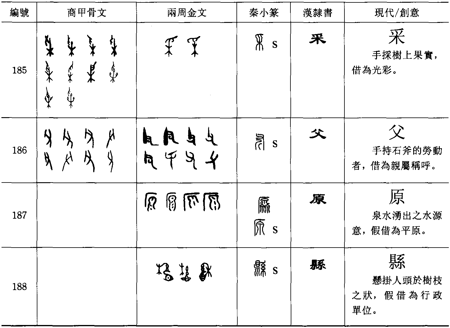 原(字187)【 ,水本也。 从灥出厂下。 , 篆文从泉】加水=源【《廣韻》,源,水原曰源】,泉水湧出的源頭,借為平原。縣(字188) 【 , 繫也。 从系持𥄉。 】加心=懸 【《廣韻》, 懸,俗,今通用】,懸掛頭顱於樹上,借為行政單位。前(字189) 【 , 不行而進謂之歬。 从止在舟上】加水=湔【《廣韻》,湔,洗也。一曰水名,出蜀玉壘山】,洗足於盆中,借為時間副詞。叟(字190)【 ,老也。 从又灾。 ,籀文从寸。 , 叟或从人】加手=搜 【搜,眾意也。一曰求也】,持火把於屋內搜索,借為老人。叔(字191)【 , 拾也。 从又尗聲。 汝南名收芋為叔。 , 叔或从寸】 【 , 豆也。 尗象豆生之形也。 凡尗之屬皆从尗】加艸=菽【《廣韻》,尗,豆也。菽,上同】,手採豆莢,借為親屬稱呼。萬(字192)【 ,蟲也。 从禸。 象形】加虫=蠆【 ,毒蟲也。 象形。 ,蟇或从䖵】,蠍子形,借為數字。