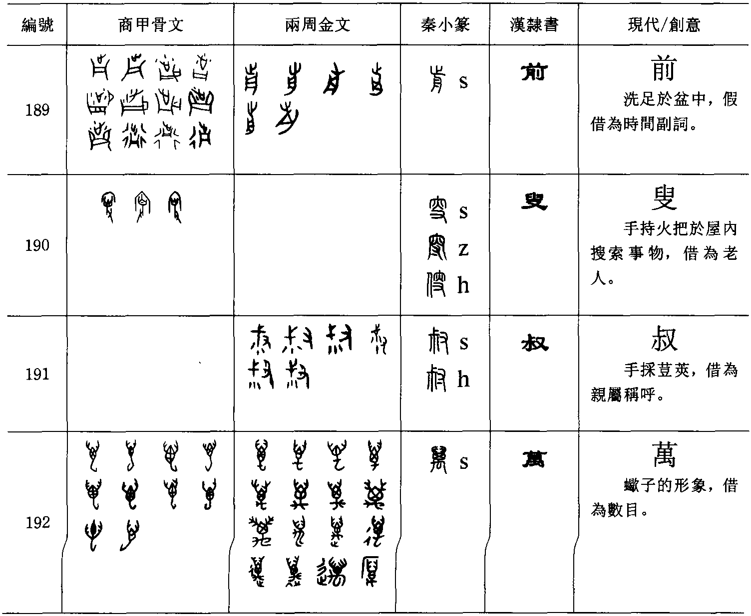 | 释义 | 三、古文字的分類許慎的六書主要是針對小篆的字形而歸納的結果,其合理性如何,從兩千年來學者要弄清楚轉注一法的衆多意見,即可看出一斑。小篆距離甲骨文的時代已有一千多年,字形已起了太多的變化,怪不得許慎常把字形解釋錯了。我們現在既知曉其前千年的文字資料,除非我們要研究許慎的體例或小篆的形體,如果真想探尋文字的造字法則,就目前來說,自應以時代較早的甲骨文與金文為主要的研究對象,不必理會《說文》分類的細節。還有,如果我們要研究的是小篆字形的歸類或條例,也就不要拿甲骨文或金文的字形去作為批判的依據。就像如要為楷書作分類,也不能依據小篆的字形。