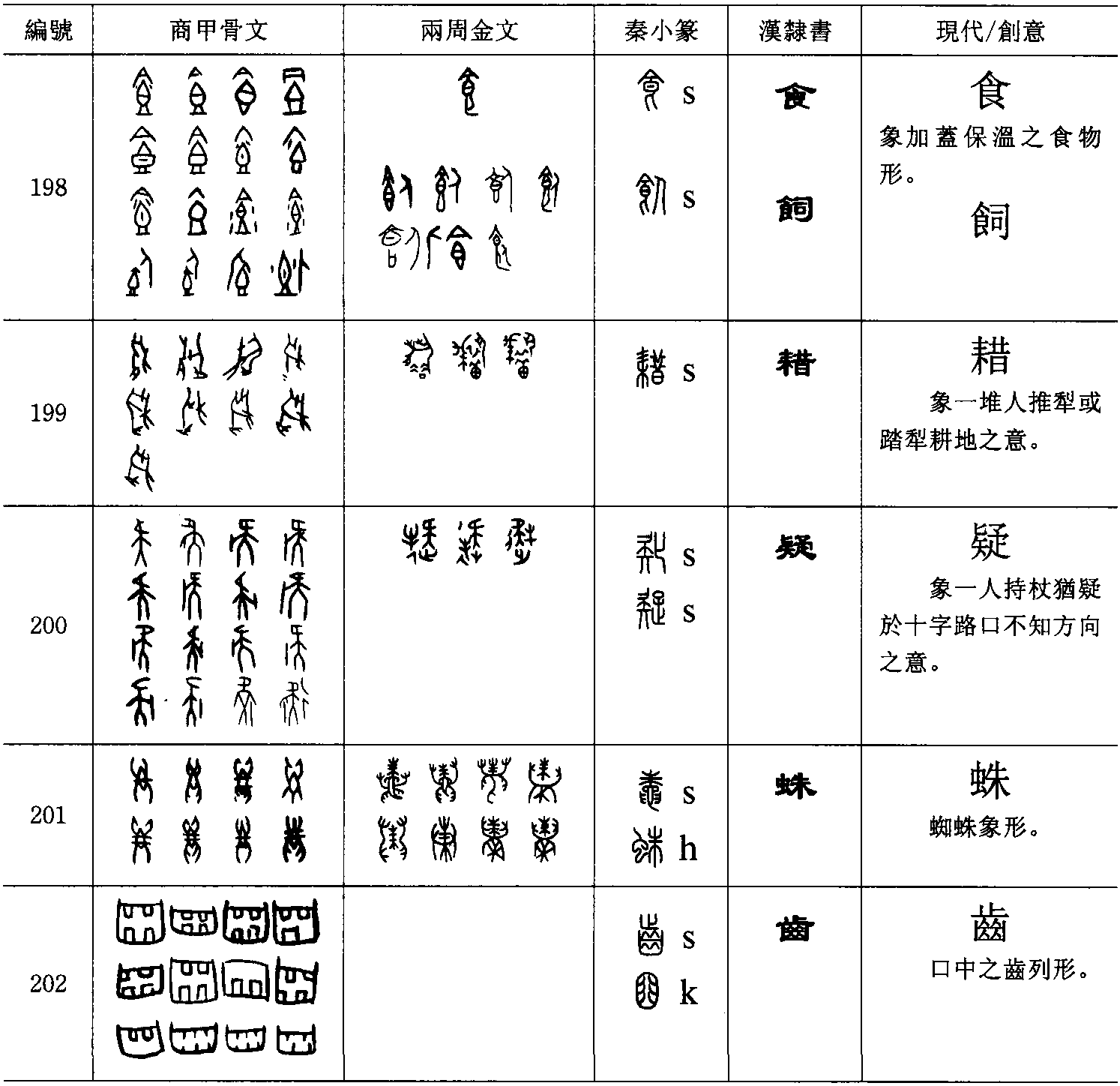 身加复聲=腹【 ,厚也。从肉复聲】甲骨文从身或从人( ) 。(b)因引申而別義,例子少。 晶(字110),衆星形象, 引申為晶亮,加生聲別義( )。食(字198)【 , 亼米也。 从皀, 亼聲。 或說, 亼皀也。 凡食之屬皆从食】,加蓋之熟食, 引申以食物飼人。 飤 【 , 糧也。 从人食】, 加人之形符以別義 ,後改加司聲別義 【《廣韻》,飤,食也。飼,上同】。(c)可能因順應音變或便利音讀而加音符。 埜(字46),林野祭祀之處,戰國時加予聲,小篆以田代林,再田土合成里而成野字 ( )。耤(字199)【 , 帝耤千畝也。 古者使民如借, 故謂之藉。 从耒,昔聲】象人推犁或踏犁耕地之意,加昔聲。疑(字200)【 ,未定也。 从匕,𥎨聲。 𥎨, 古文矢字】 【 ,惑也。从子止匕,矢聲】,一人持杖猶疑於十字路口不知往何方向之意,金文加牛聲。蛛(字201)【 ,鼄鼄也。 从黽,朱聲。 ,鼄或从虫】,蜘蛛象形,加朱聲,後以虫代黽。齒(字202)【 , 口斷骨也。 象口齒之形, 止聲。 凡齒之屬皆从齒。 , 古文齒字】, 口中齒形, 可能為了與齒疾諸字區別而加止聲。肇(字203)【 ,上諱】 【 ,始開也。 从戶聿】, 以戈破門製造事端 (或以礪石磨戈為開刃之始)。 金文加上聿。 聿字古讀如riwƏt,屬物部,肇讀如diaw,屬宵韻。兩者不同韻,不符諧聲條件。但又想不出聿與肇有何創意上的關係,也許這也是上古一字發二音的例子,暫以為聲符。鑪(字204)【 ,方鑪也。从金,盧聲】,有支架的火爐形,加虎聲。臧(字205) 【 , 善也。 从臣戕聲。 , 籀文】, 戈刺瞎奴隸眼睛,加爿聲。蠹(字206)【 ,木中蟲。 从䖵橐聲。 , 蠹或从木。 象在木中形。譚長說】,原先應作蠹蟲之形,商代已加橐聲。