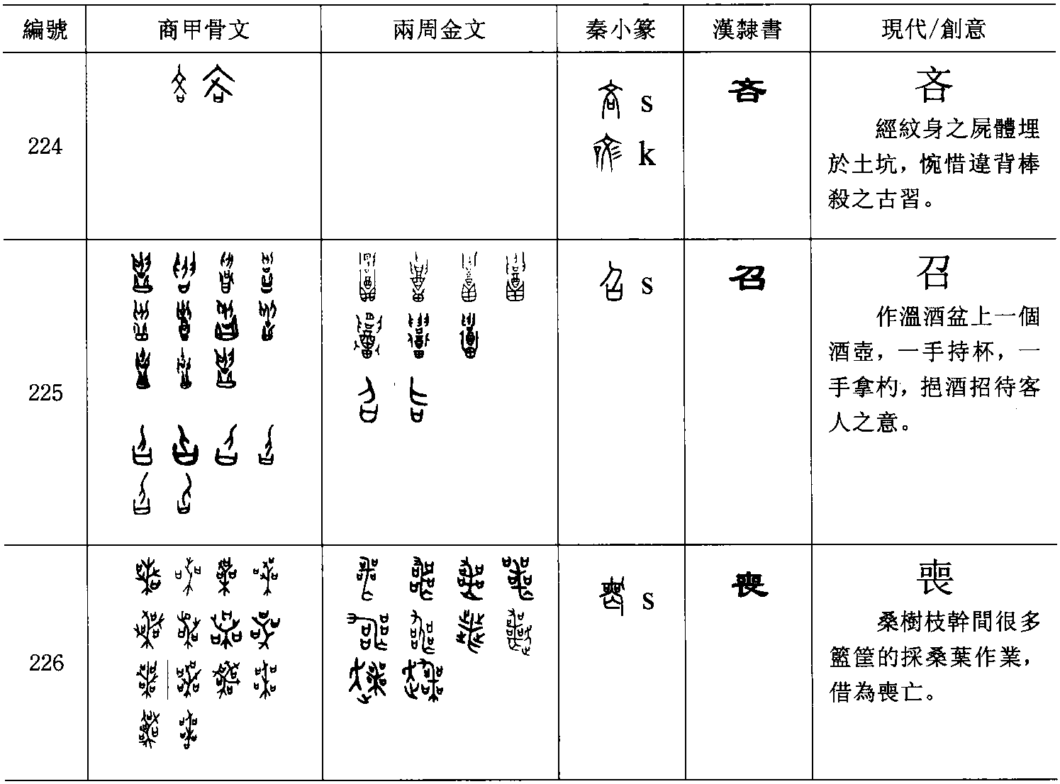 召(字225)【 ,𧦝也。从口,刀聲】,初文作溫酒盆上一酒壺,一手持杯,一手拿杓,挹酒以招待客人之意,後來才簡省為一匕一口,才被誤為从口刀聲。如為形聲,就不會把聲符隱藏於衆多部件之中 (刀taw,召tjiaw)。喪(字226)【 , 亡也。 从哭亡, 亡亦聲】表現在桑樹枝幹間掛很多籃筐的採桑葉作業,借以表達喪亡。如為从口桑聲,一個口就夠了,不必三或四口,且位置不固定。亡聲顯然是起於字形的訛變 (喪sang,亡mjwang)。歸(字227)【 ,女嫁也。 从止婦省,𠂤聲。 ,籀文省】,𠂤與歸的聲母分屬不同大類,可能與古代婦女歸寧時所帶的東西(土與掃把)有關 (𠂤twər,歸kjwər)。