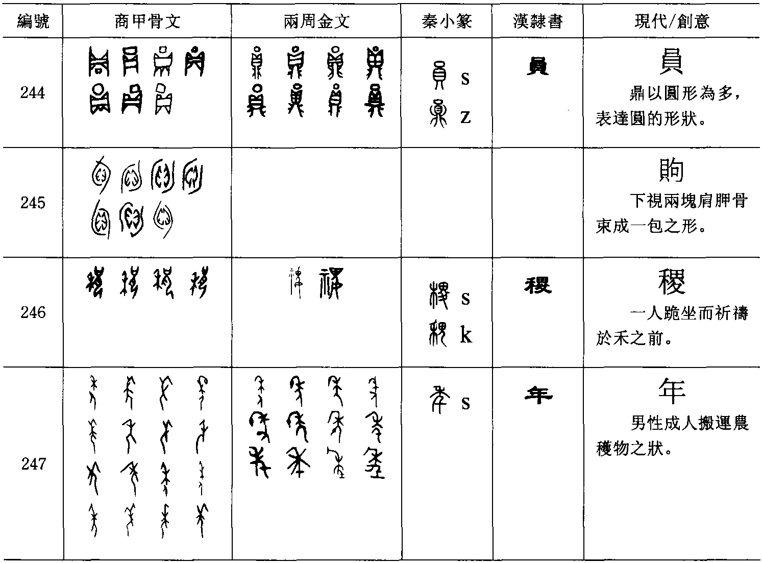 䝭(字245), 甲骨文常作為量詞使用, 為兩塊修整後的肩胛骨包成一束之狀。 寫成䝭只是為了方便, 與句聲無關。 同樣意義的句子有時寫作屯。 屯為兩版肩胛骨包成一束的側面形象,䝭則為下視的形象。 稷(字246) 【 , 齊也。 五穀之長。 从禾畟聲。 , 古文稷】【 , 治稼畟畟進也。 从田儿从夂。 詩曰, 畟畟良耜】可能以跪坐祈禱於禾神之前表意,初義為農官,後來才用以名禾之種屬。畟可能自稷字析出 (畟ts‘iək, 稷tsjiək)。年(字247) 【 , 穀熟也。 从禾, 千聲。 春秋傳曰, 大有年】表現一成年男子頭上頂着收穫的禾束狀,古代一年一熟,引申指一年的時間。年不是禾類,人與禾連接在一起不分開,較不會是形聲字 (人njien,年nen)。季(字248)【 , 少稱也。 从子稚省, 稚亦聲】, 小兒搬運收穫的禾束,天气突變時最後動用的人力,與子或稚聲無關 (子tsjieev,稚dier,季kjiwer)。