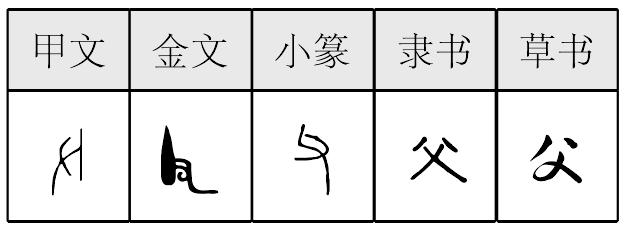 fù表意,甲骨文、金文象手持石斧之形(一说从又,象以手持杖之形,与“攴”同),小篆字形稍变,隶定为“父”。本义表示斧子,一种简单的工具,是“斧”的本字。石器时代持斧进行劳作是男子的事,故引申为父亲、对家族或亲戚中男性长辈的称呼等。 【辨析】 ❶以“父”为意符构成的字一般表示长辈男子,如:爸、爹、爺(爷)。 ❷父/爸 这两个字意义相同,读音相近,是同源字。 父fù甲骨文像手持大斧,“斧”本字。石器时代斧既是工具又是武器,多为男子汉掌握,故成年男子通称为“父”(fǔ)。甲骨文另一款手里举着的不是斧头,而是棍棒,好像是教子女守规矩,与“改”异曲同工。《说文》:“父,家长举教者。”“子不教,父之过。”此人即“父亲”。爸、爹、爷,父为意符。作声符生成的字有: fǔ 斧(班门弄斧) 釜(破釜沉舟) 滏(古水名。即今滏阳河) 父 (fù)从又舉杖。 【按】從手舉杖,會意家長、父親。 53.趣談“父”字人類跨入舊石器時代,已經能够砸石爲器,把石頭砸碎,挑選其中有銳利邊緣的作爲切削器和砍伐器,這砍伐器就是斧頭,再通過研磨就成了表面光滑具有鋒利斧刃的石斧,這就進入了新石器時代。那時的人們在族群裏生活,相依爲命。原始社會群婚群配,並且同族不婚,因此子女只知其母,不知其父,也許自己的生父是在外族裏勞動的某一男子。那時持斧者多爲族中德高望重的長者,稱之爲父老,當原始公社崩潰,家庭成立,生父方才可以確認。這就是我們今天的“爸爸”。這麼説來,“父”原來是没有柄子的“石斧”。